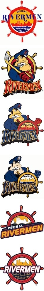First of all, there have actually been several different teams in Peoria over the last forty years, but they've all been called the Rivermen, and at least three of them were at some point in their existence owned by the same guy. It starts with the Peoria Prancers, an expansion team who joined the International Hockey League in 1982. Two years later the arena took over the team, and that was the debut of the Riverman name. Then a guy named Bruce Saurs bought the team. In 1996, after years of losses, he sold half of his stake in that team (it then moved to San Antonio and folded a couple of years later) and founded an ECHL team with the same name. Then he sold the ECHL team, and in 2005 the new owners bought an AHL team in Massachusetts, moved it to Peoria, folded the ECHL team, and named the AHL team the Rivermen. Somewhere along the way the Vancouver Canucks bought the AHL team and moved them to Utica (today that team is the Abbotsford Canucks). So Bruce Saurs came back and formed the SPHL team with a couple of former team executives. Then there are the logos. As you can see, there have really only been two over the years. The first featured the Peoria skyline as seen from across the Illinois River surrounded by a ship's wheel. That was the original IHL logo. Then came the second IHL logo and the first logo to feature "The Captain", who was holding a hockey stick, chomping on a hockey puck in his mouth, and standing in front of ship's wheel. When the team moved to the ECHL, the team picked a new logo which was basically a combination of the two AHL logos: The Captain remained, but now he was holding a ship's wheel which once again had the Peoria skyline inside it. (The wordmark from the second IHL logo remained as well.) When the AHL team debuted, the logo remained the same except that the colors changed. Then came the SPHL team, and the team returned to a variation of the original logo, or at least the top half of it. It was a much better logo (let's be honest, the original logo looks pretty amateurish; the new ones look quite professional), and part of that is that the bottom half of the ship's wheel was removed. Then the team decided to put the bottom half back, which was a step in the wrong direction in my opinion but still a lot better than the original. And now the Captain is back. He's wearing white this time instead of the blue all of his previous incarnations wore, and he's back to holding a hockey stick while standing in front of a ship's wheel. There are a couple of other differences — the cap now features an anchor instead of a capital R, he's no longer holding a puck with his teeth — but you don't have to look closely to see this is the same huge-nosed, huge-chinned Captain as before. Personally, I was never fond of the Captain. Maybe it's because he looks like a descendant of the Hapsburgs with that nose and jaw. (Go look for a painting of Charles II of Spain if you don't know what I'm talking about.) Maybe it's the vaguely crazed facial expression, which now that I think about it looks like Charles II as well. I mean, let's face it, when a genetic defect caused by several generations of inbreeding on a level that puts any jokes about Tennessee to shame* gives you an underbite so extreme you can hardly chew, there's only so many facial expressions you can make. But whatever it is, I personally prefer the logos without the Captain...who, I should note, I can't help but think of now as "Captain Chucky". I'm especially fond of the first one used by the SPHL team. It's not exciting, but it's not goofy, either. It conveys the idea of a riverman without resorting to cartoon characters or other silliness. It has an elegance to it. Which is more than I can say for Captain Chucky's chin.