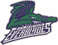 Notice: All logos on this page are included within the parameters of 17 U.S.C. § 107, which states that the reproduction of a copyrighted work for purposes of criticism and/or comment is not an infringement of copyright. No challenge to the copyrights of these logos is intended by their inclusion here. Posted 2005 March 10 This is truly going to be a challenge to my scoring. There are so many penalties that kinda sorta apply that I hardly know what to do with them all. First, there's the "Irrelevancy" penalty. Is an alligator relevant to the name? Obviously they're relevant to the Everglades, but the team's name is Everblades, not Everglades. Do I count that? Does the fact that the alligator is in the shape of a hockey skate help matters any? What about equipment in the logo? There's obviously a skate in the logo except for one minor detail, which is that there isn't actually a skate in the logo. How do I score that? Does the fact that the team colors were deliberately chosen to match the Hartford Whalers – the team their NHL affiliate used to be, but wasn't anymore even when the team debuted in 1998 – mean they earn the "Offspring" penalty? I think I'm going to give them a bunch of half-penalties and save myself a lot of thought. Hell, maybe I'll just give them half-penalties for every single penalty out there and see what happens. The scary thing is I honestly believe they wouldn't have the highest score. There are undoubtedly some goofy aspects to this logo – most notably the shoelaces on the alligator's nose – but all in all I like this logo. Green and blue is a neat color scheme. The alligator looks pretty sinister (the ghostly white eyes help on this front), And I like the font the name is written in. The only thing I don't like is that I keep thinking of alligator-skin boots. How could I not? The name, on the other hand, doesn't thrill me nearly so much. Wordplay needs to be audacious on the level of "Macon Whoopee" or else it just sounds silly. "Everblades" is not audacious enough. And how many freaking teams did the ECHL have in Florida when this team showed up? Four, that's how many. Most of them are gone now, but at the time there were the Pensacola Ice Pilots, Tallahassee Tiger Sharks, Jacksonville Lizard Kings, and Miami Matadors. And this team decided to call itself "Florida". Wow, how's that for chutzpah? Forunately for them the rules only allow me to give them points for teams still in the league, or else the points just for the "Regional" penalty would be 115 points. NOTE: I checked, and I was right: They wouldn't have the highest score if I just gave them half penalties for everything. They'd have 95 points that way.