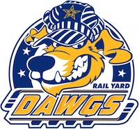 Notice: All logos on this page are included within the parameters of 17 U.S.C. § 107, which states that the reproduction of a copyrighted work for purposes of criticism and/or comment is not an infringement of copyright. No challenge to the copyrights of these logos is intended by their inclusion here. Posted 2023 November 30 NOTE: This review incorporates text from the previous review for the Rail Yard Dawgs, posted on 2016 November 13. The Roanoke Rail Yard Dawgs actually changed their logo back in 2020, but I'm just now getting around to doing the review. I'm not sure why. Maybe I didn't consider this logo different enough from the original. Maybe it's because they didn't play the 2020-21 season thanks to the pandemic. Or maybe I had enough stress going on that year (didn't we all?) and couldn't bear to look at this awful logo for this team with an awful name any more than necessary. And it is an awful name and an awful logo. We'll start with the name. Rail Yard Dawgs. They obviously started with the expression junkyard dog and changed it to railyard to tie in to Roanoke's history as a railyard hub, and then changed the spelling of Dogs to Dawgs because they didn't realize what a stupid thing to do that is. But there's a major problem here, which is that a junkyard dog is a good idea and a railyard dog is an incredibly bad idea. Junkyard dogs guard the junkyard during off hours. Railyard dogs, on the other hand, just get in the trains' way. Or, worse yet, they get run over by the trains. Yeah, that's grim, but it's not like trains can stop on a dime, so if the dog doesn't get out of the way for whatever reasons, it's going to get killed. And I could be wrong, but I'm fairly certain not that the image the team is trying to convey here. And then there's the logo. A disembodied daw— er, dog's head wearing an engineer's cap (or is that a conductor's cap? Is there a difference? If so, what is it?) hovering over what I presume is supposed to be the word DAWGS made into a boxcar, except that the boxcar is slanted in a way that I'm fairly certain would interfere with a boxcar's job of carrying cargo. Also, the wheels are in the wrong spot. And then there's the partial circle in the backgr— you know what? I don't have time or space to write everything that's wrong with this logo. Let's just say that it's really bad and leave it at that.